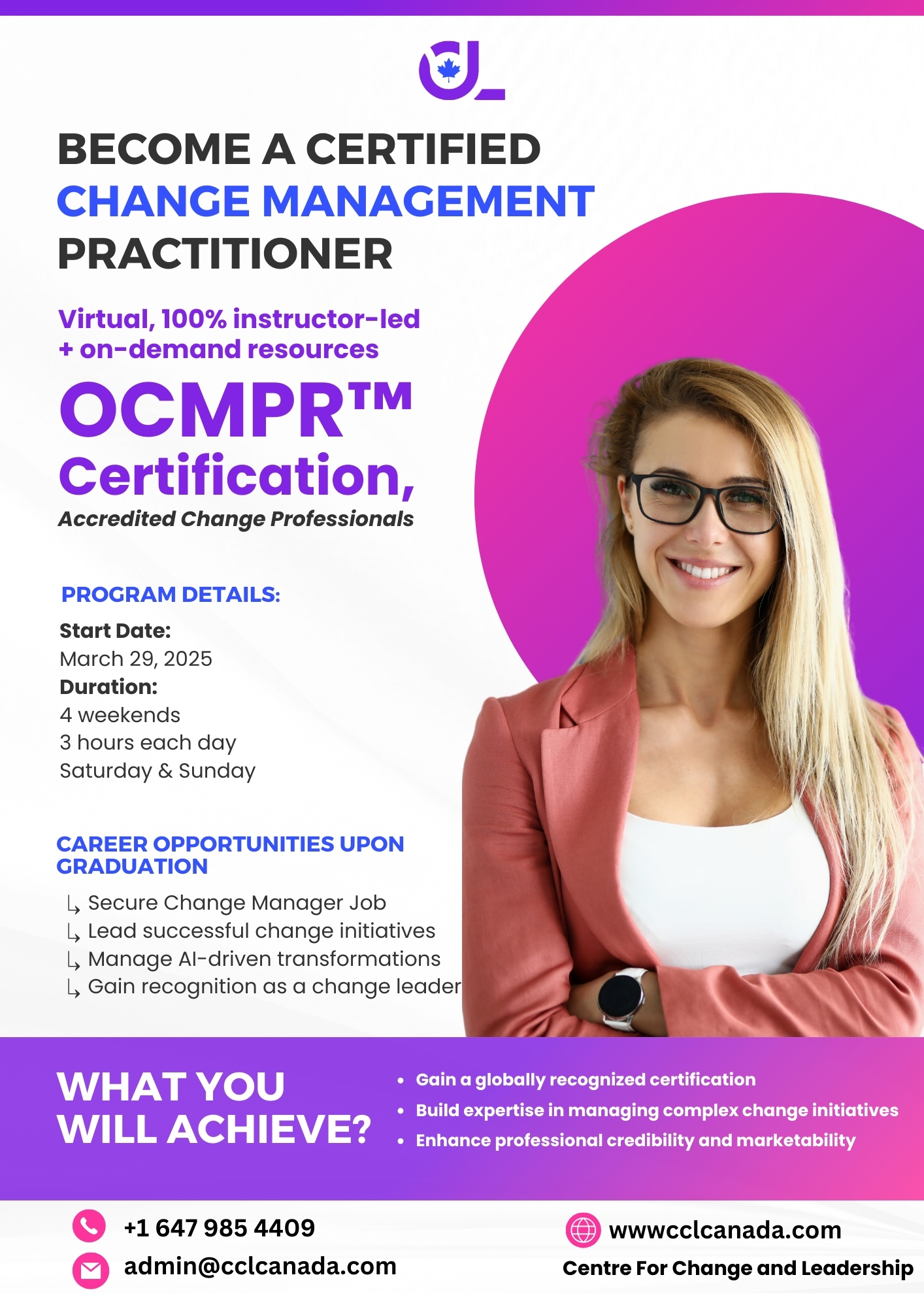 At CCL Canada, we offer ISO-certified courses that provide a comprehensive, AI-enhanced approach to change management training. Our programs emphasize practical, hands-on learning, combining advanced AI strategies with real-world applications to equip professionals with the skills needed to lead effective change. Delivered by experts with over 20 years of experience, our courses also provide a globally recognized certification, ensuring your education is both valuable and respected worldwide.